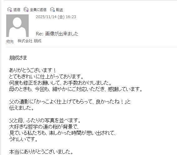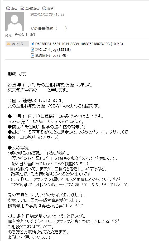 以前にお母様の遺影をご依頼頂いた東京都府中市のお客様より再度ご依頼頂きました。 https://housei-k.com/information/55383.html 実際の加工例 https://housei-k.com/category/works