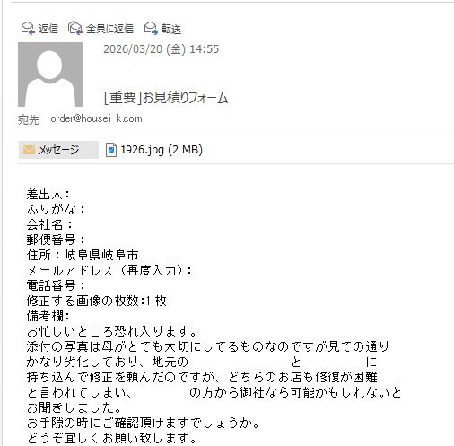 岐阜県岐阜市のお客様よりご依頼頂きました。 https://housei-k.com/information/56571.html 実際の加工例 https://housei-k.com/category/works