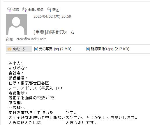 東京都世田谷区のお客様からご依頼頂きました。 https://housei-k.com/information/56729.html 実際の加工例 https://housei-k.com/category/works