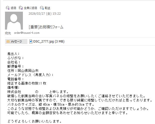 岡山県岡山市の法人のお客様よりご依頼頂きました。 https://housei-k.com/information/56758.html 実際の加工例 https://housei-k.com/category/works
