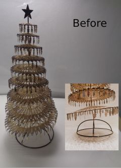 こちらは、約50年前にヨーロッパで作られた、高さ23cmの小さなシルバーツリー。倉庫に眠っていた間に、茶色く変色し、ツリーの枝も曲がってしまっていました。 お客様の「また飾りたい」という願いを叶