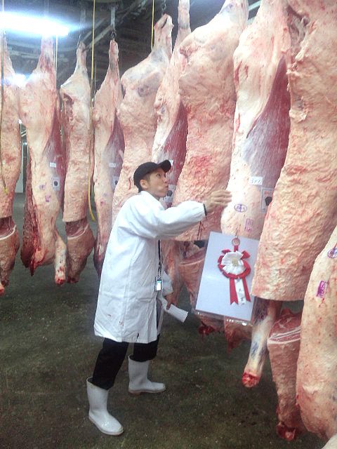 競り前の懸肉室では、枝肉をしっかりと見て選んでました。