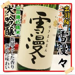 『雪漫々大吟醸』は禅の言葉より由来しています。 出羽桜大吟醸の二年熟成酒。 『雪漫々大吟醸』は馥郁とした香りと豊に熟れた味わいが特徴です。『雪漫々大吟醸』は美しく華やかな香りが楽しめ、甘味を感じつつサ