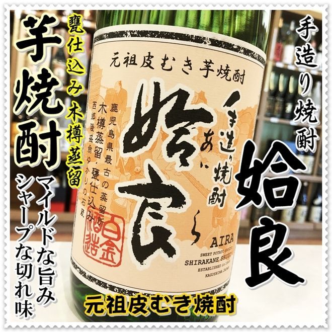 「姶良」の蔵元、白金酒造の歴史は古く、西郷隆盛翁もこの蔵に立ち寄ったとされています。『姶良』は北九州界隈の酒販店グループが企画して白金酒造で造られた芋焼酎、いわゆるプライベート・ブランドです。「姶良」は普通の芋焼酎とは違ったつくりをする焼酎で、基本的な工程は同じです。「姶良」の仕込みに使う芋の皮をむくのが特徴で、皮むき器を使って手作業でむきます。一般に芋焼酎に使う芋は、芋の両端や傷んでいる部分を包丁で切り落とす処理は行うものの、皮をむくという作業は通常は行いません。芋を手に取り、一仕込み分、1.2トンの芋の皮を皮むき器でひとつひとつむいて行きます。皮むきが終わるとすぐに蒸しにかかり新鮮なうちに仕込みを行います。「姶良」の仕込みは昔ながらの和甕です。蒸留は木桶蒸溜器でゆっくりと時間を掛けて蒸留をして行きます。昔ながらの絶妙な味わいはこの蒸溜器でないと出せないとの事。「飲むほどに深い柔らかな旨み。うるおいのあるシャープな切れ味」「姶良」をお楽しみ下さい。