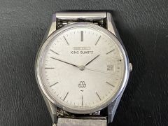 時計のお買取です。こちらはセイコーキングクオーツ。見ての通りかなり古いタイプの時計です。風防にも傷が入っており、結構使用感がございます。不動のため動作確認不可です。クオーツのため電池の液漏れのリスクも
