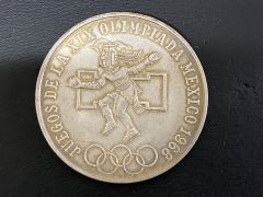 銀貨のお買取です。こちらは1968年メキシコオリンピックの記念銀貨。額面は25ペソです。現在のレートで1メキシコペソは約9円なので、日本円に直すと225円の価値ですが、銀貨のためもちろんそれ以上の価値