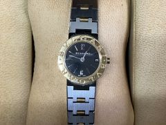 ブルガリのお買取です。こちらはレディースのクオーツ。箱、余りコマ、取説、保証書など全て付属品が揃った状態でお買取させて頂きました。時計本体は使用感やキズなどはございますが、特に大きなダメージはございま