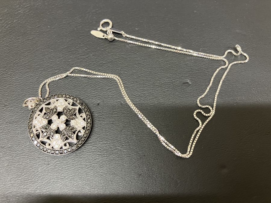 ネックレスのお買取です。こちらはK18ホワイトゴールド。トップはメレーダイヤとブラックダイヤが散りばめられています。なかなかデザイン性の高いネックレスです。こういったデザインもしっかりと査定します。ぜひおまかせください。おかげさまで13周年!金・プラチナ・ダイヤモンドのお買取りもおたからや箕面店へ! ※お車でお越しの際はイカリスーパーさん向かいの市営第2駐車場へ。無料駐車券お渡ししております。