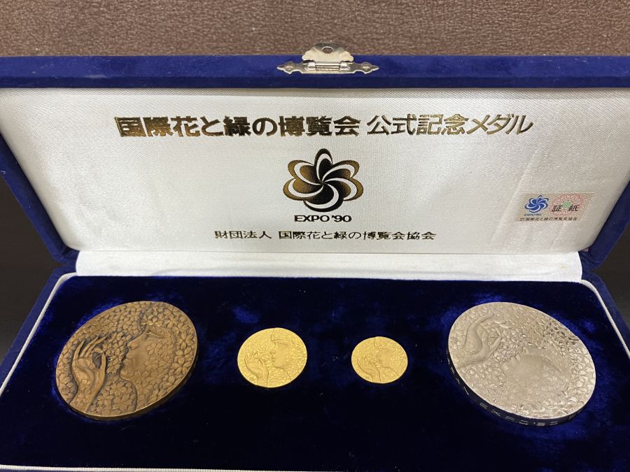 記念メダルのお買取です。こちらは国際花と緑の博覧会、通称花博です。開催は1990年。金が2個、銀が1個、銅が1個収められています。1990年といえば平成2年。バブル絶頂期です。金相場は当然今よりもかなり安く、好景気も相まってかなりの数が販売されたのではないかと推測出来ます。どのようなメダルでもおまかせください。おかげさまで13周年!記念メダルのお買取りもおたからや箕面店へ! ※お車でお越しの際はイカリスーパーさん向かいの市営第2駐車場へ。無料駐車券お渡ししております。