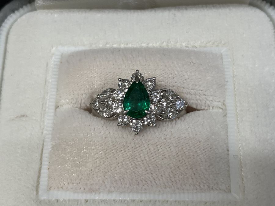 エメラルドリングのお買取です。エメラルドは0.65カラット。取り巻きのメレーダイヤは0.98カラットございます。枠はプラチナが使われています。エメラルド、ダイヤモンド、プラチナ、デザイン性など総合的に査定致します。ぜひおまかせください。おかげさまで13周年!エメラルドのお買取りもおたからや箕面店へ! ※お車でお越しの際はイカリスーパーさん向かいの市営第2駐車場へ。無料駐車券お渡ししております。