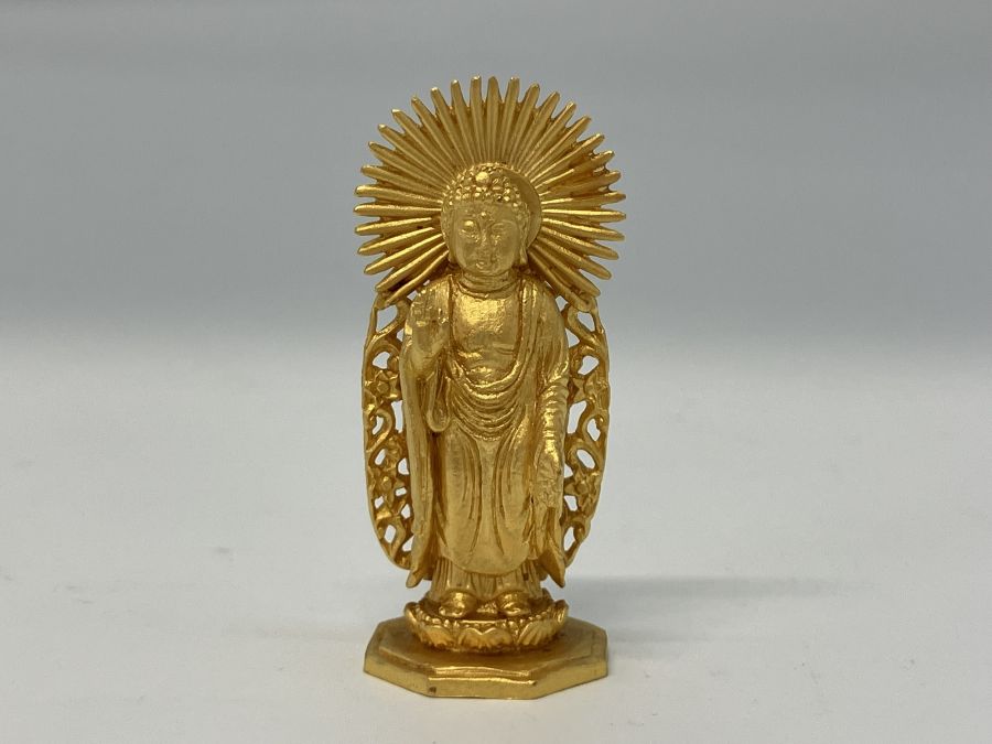 金工芸品のお買取です。こちらは純金製の仏像。宗教的な意味合いがある物ではなく、金製工芸品となります。こういった工芸品はデザイン料や加工賃、販売にかかる経費などのコストが非常にたくさんかかっており、販売価格は当然金相場よりもかなり高くなります。しかしながら昨今の金相場の高騰により、数十年前のご購入時の販売価格よりも現在の買取価格の方が高くなる逆転現象も起こっております。