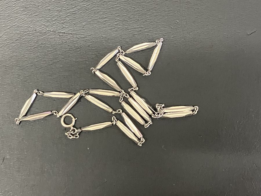 ネックレスのお買取です。こちらはプラチナ。もう新たに販売はしていないだろうというレトロなデザインのネックレスです。一見細身のネックレスに見えますが、結構な重量がございます。実は古いアクセサリーほど重量感があるものが多く、最近は細めのリングやネックレスが主流ではありますが、貴金属高騰のため原材料が高くなってしまったのも一因ではないかと思います。昔はリングもネックレスもボリュームがあり、派手なものが好まれました。尚且つ当時の金・プラチナなどの貴金属の価格は現在の1/10程度です。50年から60年ぐらい前の古いアクセサリーも今なら高値でお買取出来ます。ぜひおまかせください。おかげさまで14周年!金・プラチナ・ダイヤモンドのお買取りもおたからや箕面店へ!