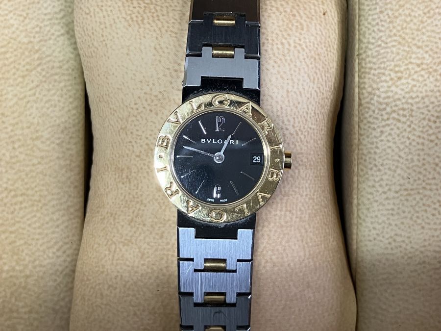 ブルガリのお買取です。こちらはレディースのクオーツ。箱、余りコマ、取説、保証書など全て付属品が揃った状態でお買取させて頂きました。時計本体は使用感やキズなどはございますが、特に大きなダメージはございません。但し不動です。動いておりません。不動の状態でも前回の電池交換の時期や、竜頭の動きなどでダメージ度合いを判断し、お買取させて頂いております。ぜひおまかせください。おかげさまで14周年!ブルガリのお買取もおたからや箕面店へ!